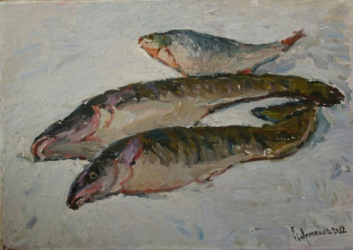 Похоже - вы заядлый рыбак. Рыба фигурирует на многих полотнах. Я уже давно не рыбак, но рыбу ем почти каждый день. Вкусная картина.